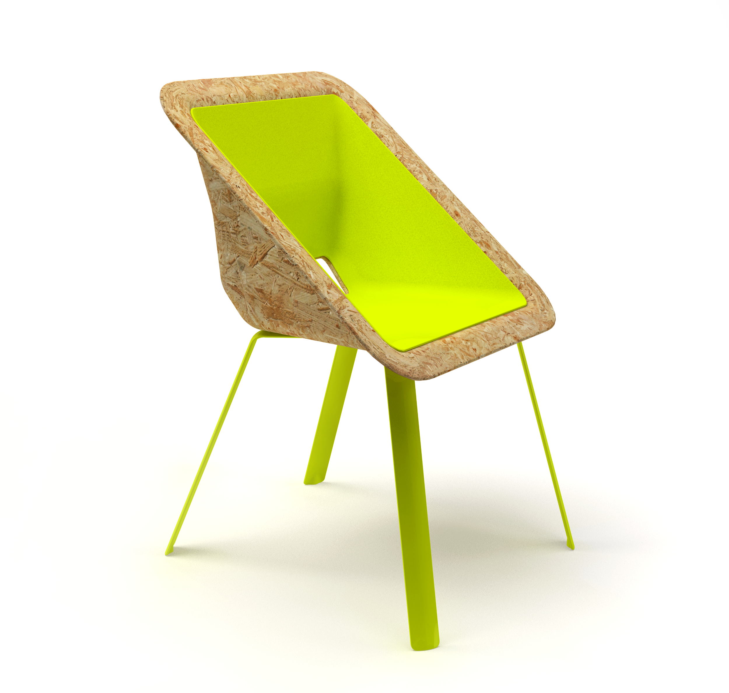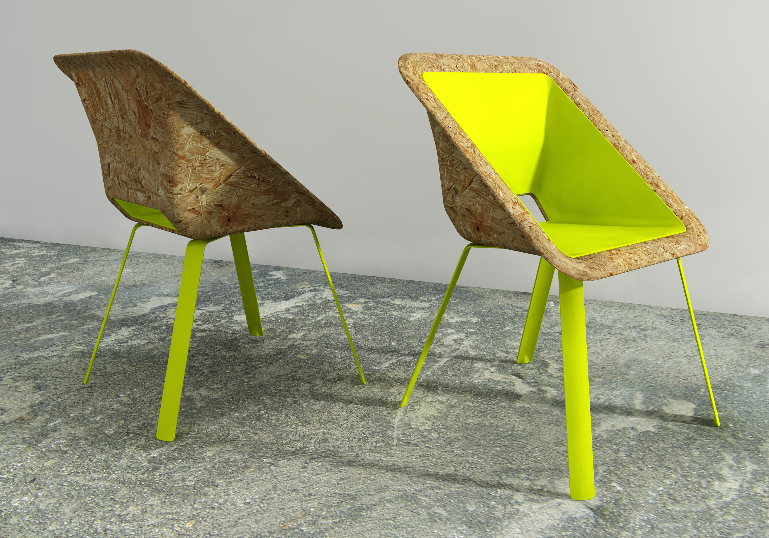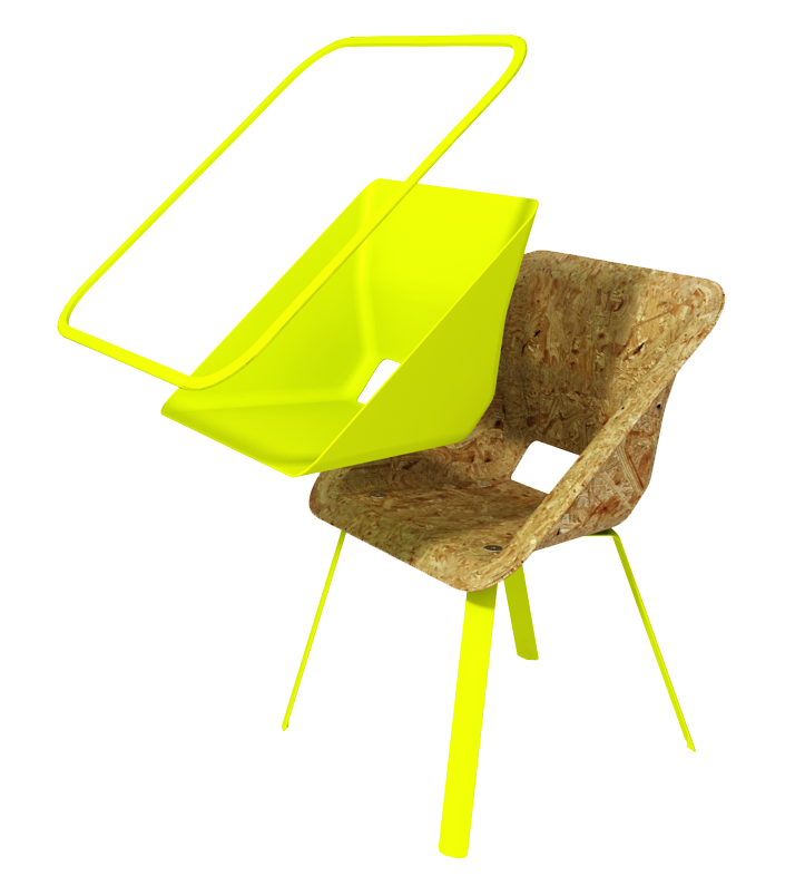 Projekt krzesła z wykorzystaniem technologii prasowania wiórów drzewnych. Prosta konstrukcja redukuje ilość elementów ułatwiając montaż. Siedziska i metalowe nogi sztaplują się do transportu. Opcjonalna miękka wkładka dodaje odrobinę komfortu.